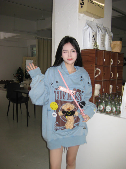 13De Marzo x Smiley Broken Pin Badge Bear Hoodie Cerulean