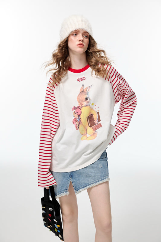 Alexia Sandra Big Bunny Contrast Color Stripe Long Sleeve T-Shirt Red