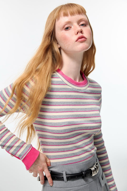 Alexia Sandra Stripe Round Neck Knit Top Grey/Pink