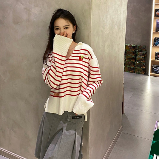 Alexia Sandra Stripe Strawberry V-Neck Polo Shirt Red