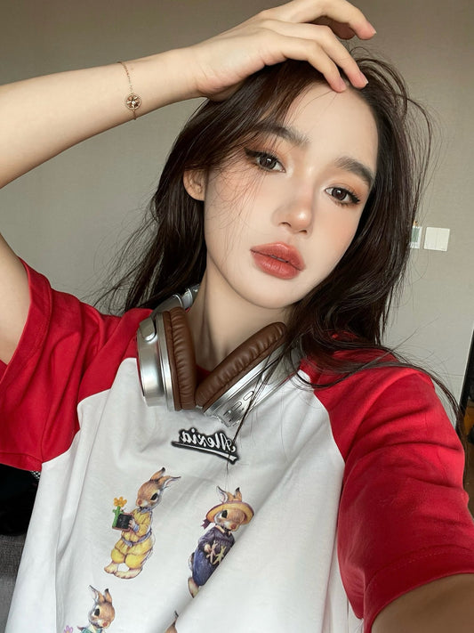 Alexia Sandra Four Bunnies Contrast Color Raglan T-Shirt Red/White