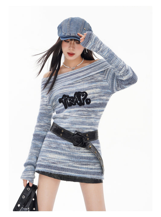 BLUREMO Gradient Off Shoulder Letter Sweet Knitted Sweater