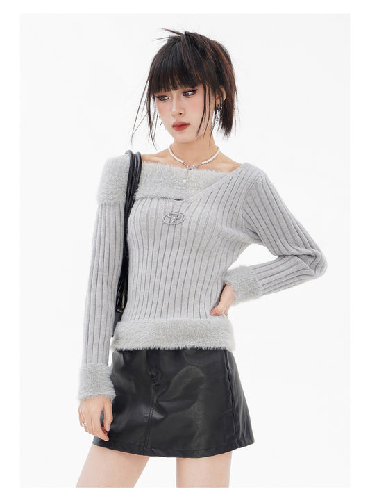 BLUREMO Off Shoulder Fur Stripped Sweater