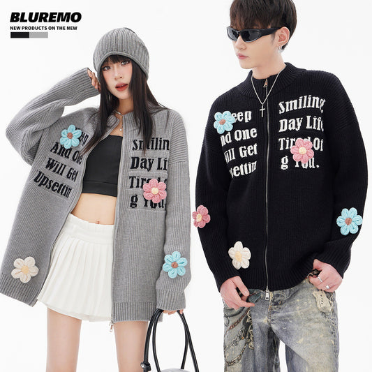 BLUREMO Double Zip Jacquard Letter Floral Knitted Jacket