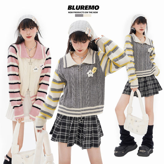BLUREMO Twisted Double Zip Striped Star Cardigan