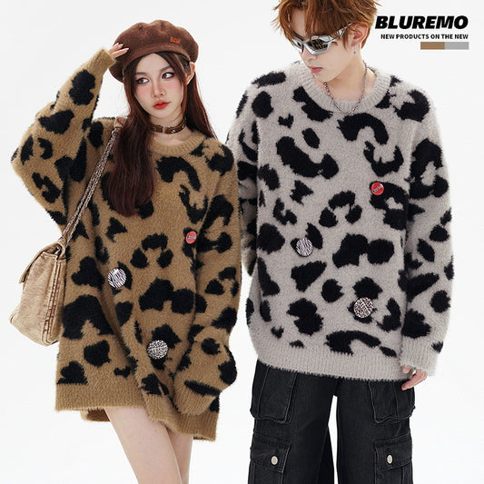 BLUREMO Retro Leopard Print Metal Badge Sweater