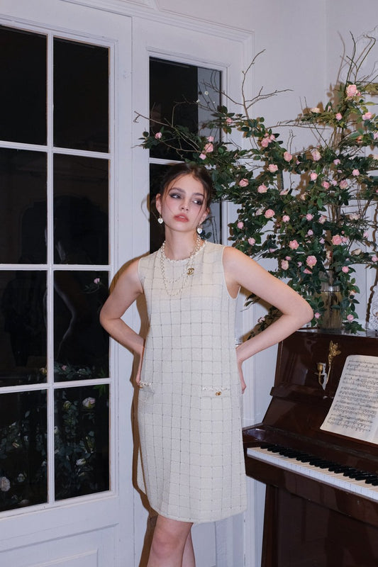 DIANA VEVINA Black and White Check Tweed Ruffle Neck Sleeveless Dress