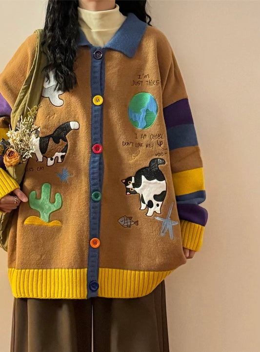 ✦FX✦ Retro Kitten Embroidered Striped Knit Cardigan Brown