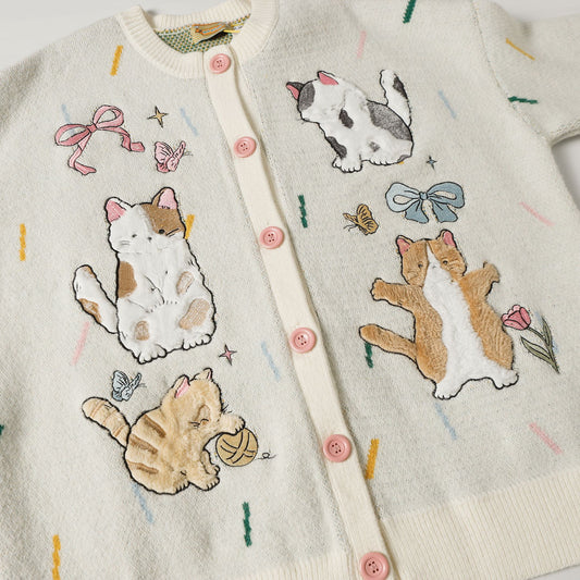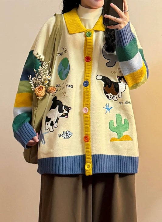 ✦FX✦ Retro Kitten Embroidered Striped Knit Cardigan Beige