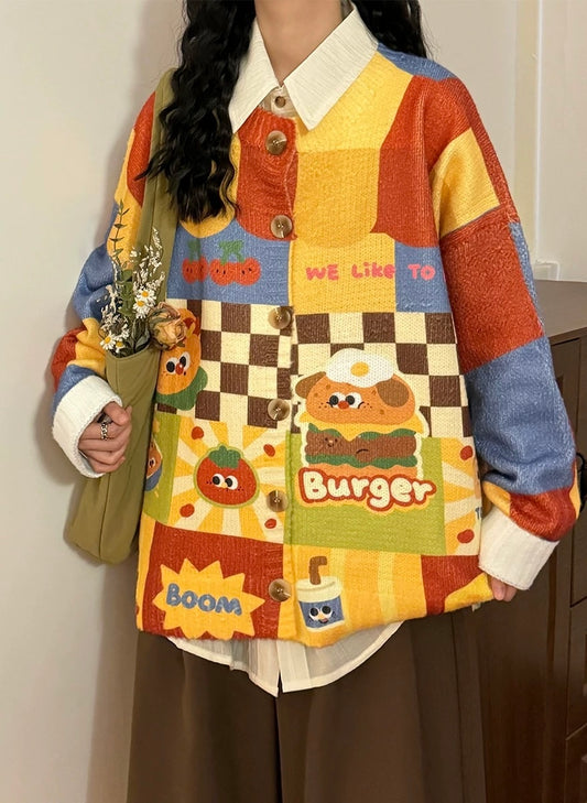 ✦FX✦ Retro Hamburger Puppy Print Casual Cardigan