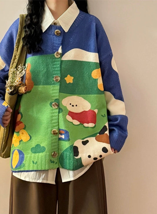 ✦FX✦ Retro Cutie Puppy Fun Print Casual Cardigan
