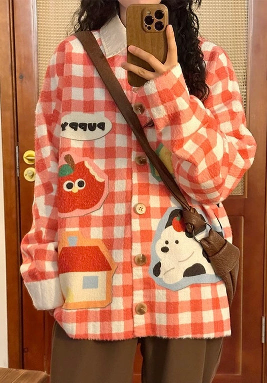 ✦FX✦ Retro Cutie Puppy Red Grid Casual Cardigan