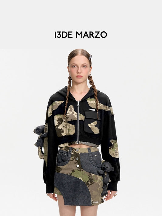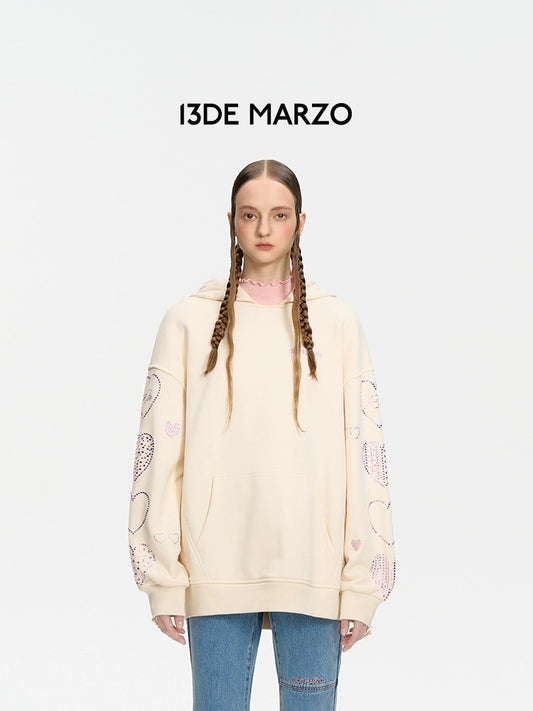 13DE MARZO Doozoo Rhinestone Heart Hoodie Beige