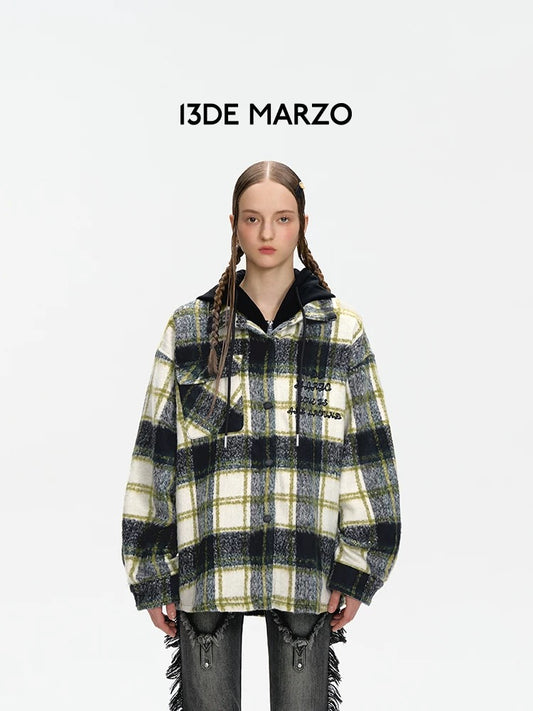 13DE MARZO Woolen Plaid Bear Hoodie Golden Cypress