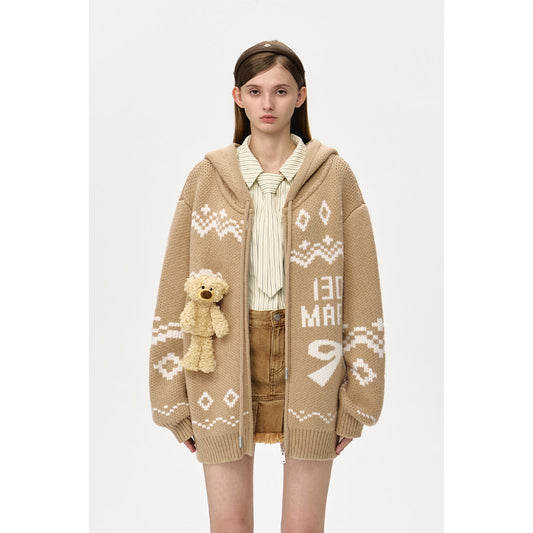 13DE MARZO Fair Isle Bear Zip Knit Hoodie Khaki