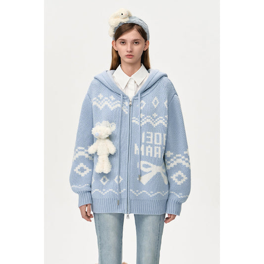 13DE MARZO Fair Isle Bear Zip Knit Hoodie Blue