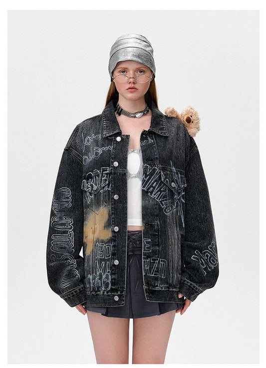 13DE MARZO Slogan Graffiti Denim Jacket Black