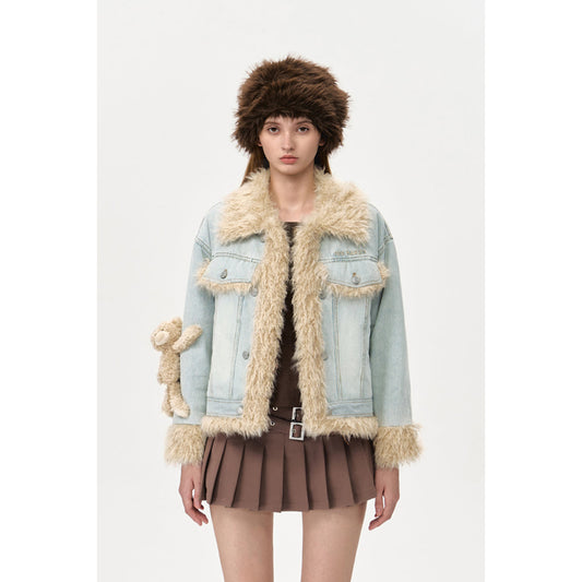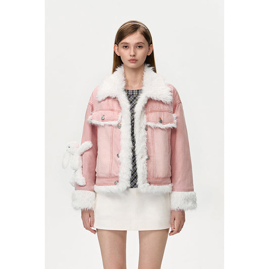 13DE MARZO Doozoo Fleece Patchwork Denim Jacket Pink