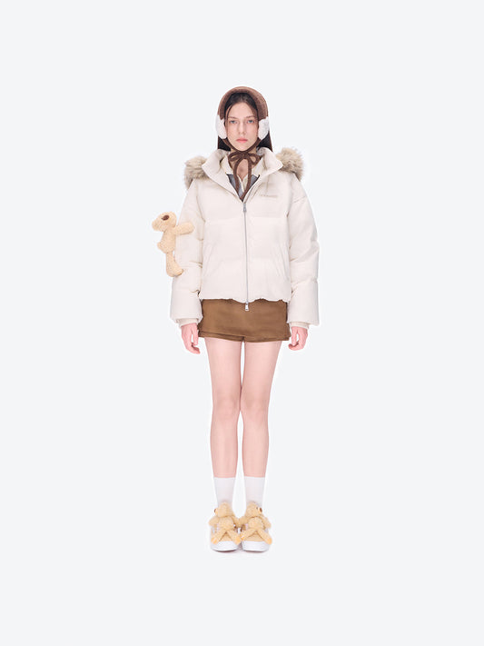 13DE MARZO Bear Fuzzy Hood Down Jacket Almond