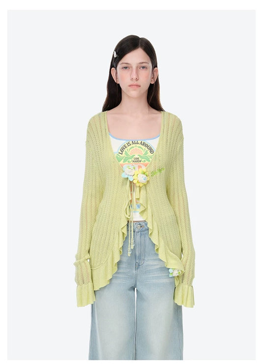 13DE MARZO Floral Lines Hollow Cardigan Green