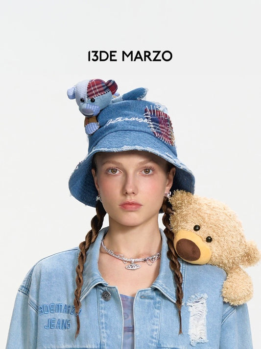 13DE MARZO Plaid Patch Denim Bucket Hat Blue