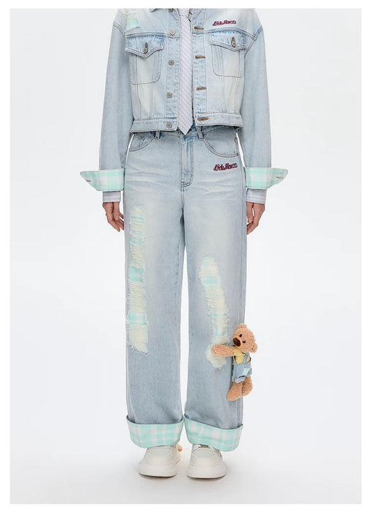 13DE MARZO Plaid Cuffed Sleeve Denim Pants Blue