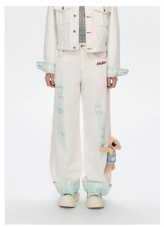 13DE MARZO Plaid Cuffed Sleeve Denim Pants White