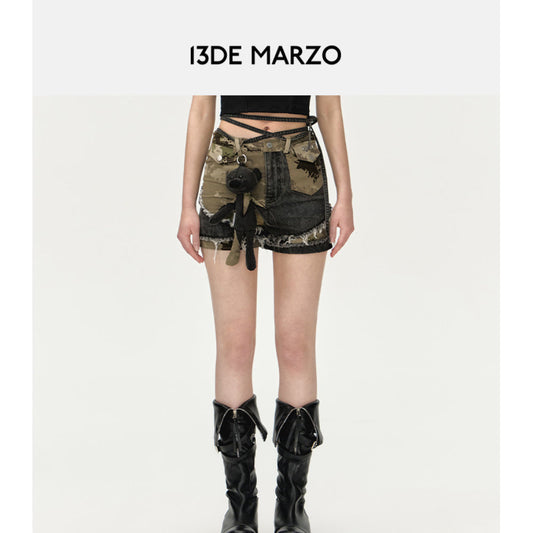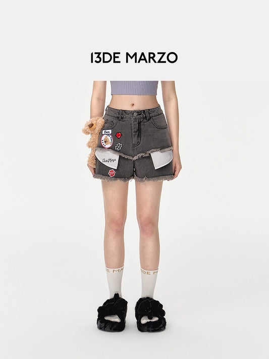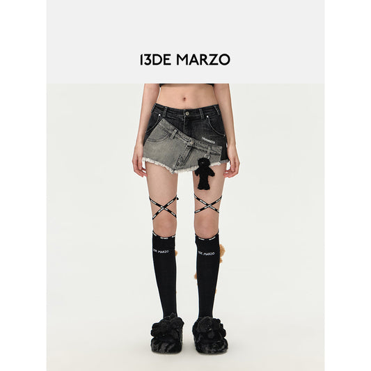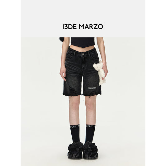 13DE MARZO Logo Patch Bear Denim Shorts Black