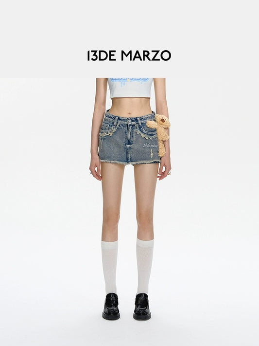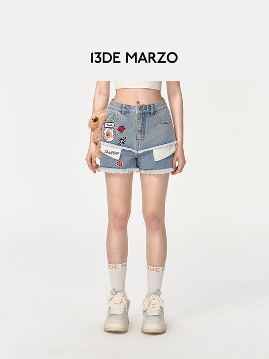 13DE MARZO Logo Patch Bear Denim Shorts Blue