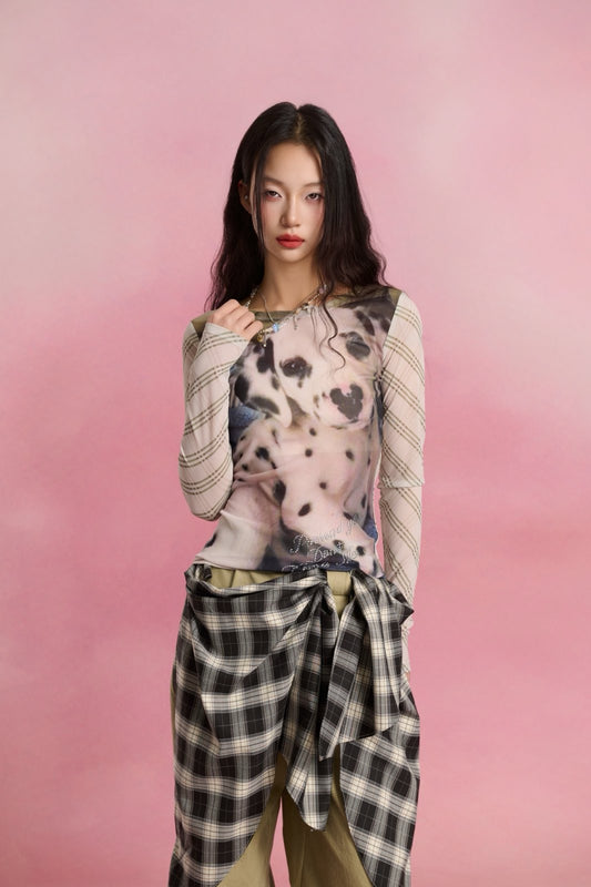 Sofitte Plaid Patchwork Dalmatian Dog Print Long Sleeve Top