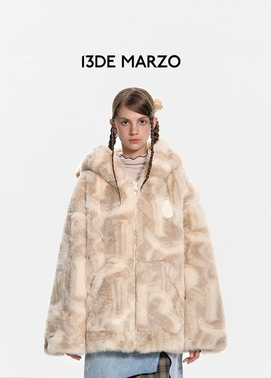 13DE MARZO Artificial Fur Logo Coat Antique White