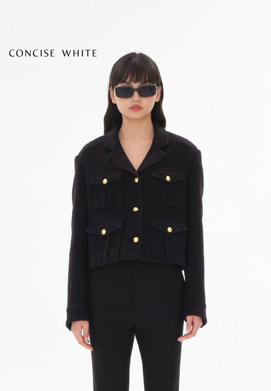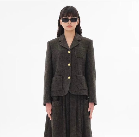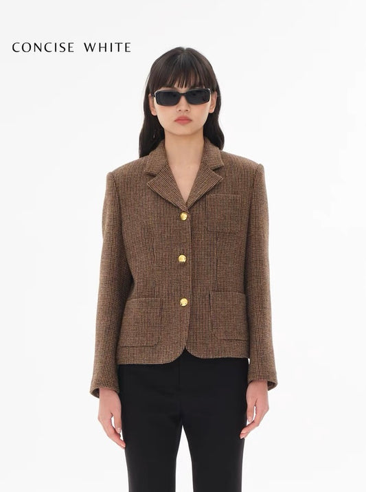 Concise-White Plaid Patchwork Roundneck Wool Suit Coffee