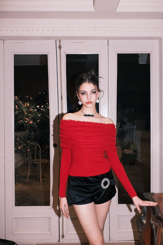 DIANA VEVINA Fringed Twisted Flower One-Shoulder Knit Red