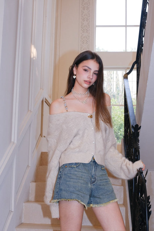 DIANA VEVINA V-Neck Off-The-Shoulder Twisted Knit Apricot