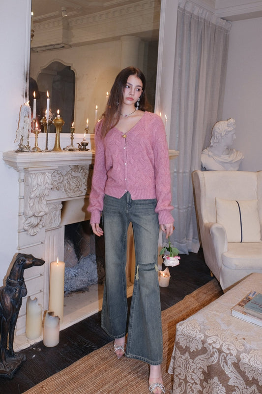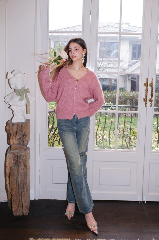 DIANA VEVINA V-Neck Off-The-Shoulder Twisted Knit Pink