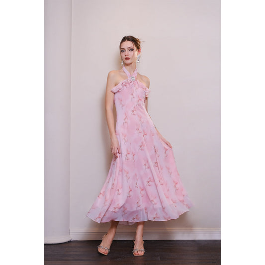 DIANA VEVINA Asymmetrical Hem Halter Long Dress Pink