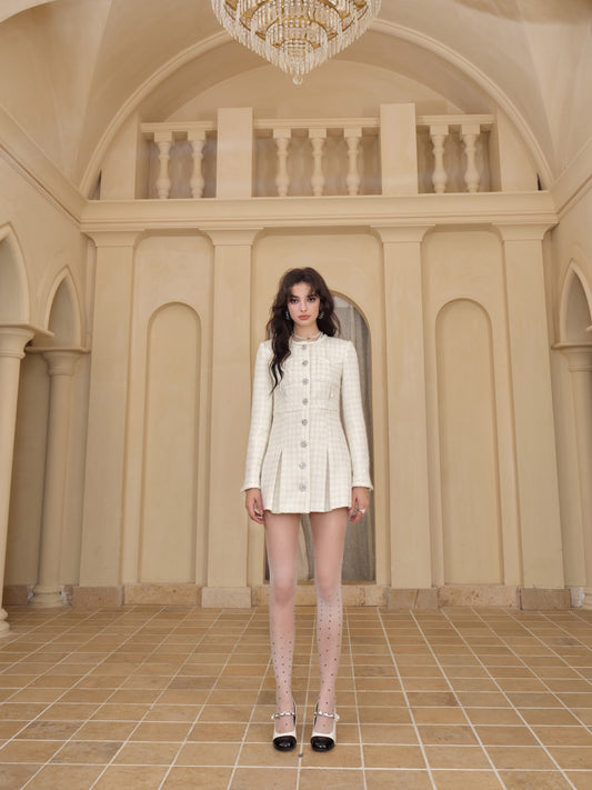 DIANA VEVINA Tweed Long Sleeve Dress Beige