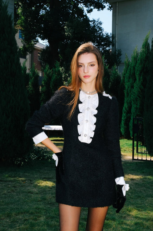 DIANA VEVINA Ruffled Vintage Patchwork Dress Black