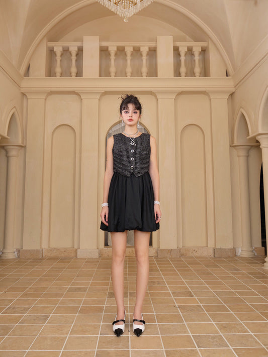 DIANA VEVINA Rhinestone Plaid Panel Sleeveless Dress Black