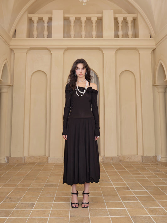 DIANA VEVINA Off Shoulder Waistband Black Rose Long Dress