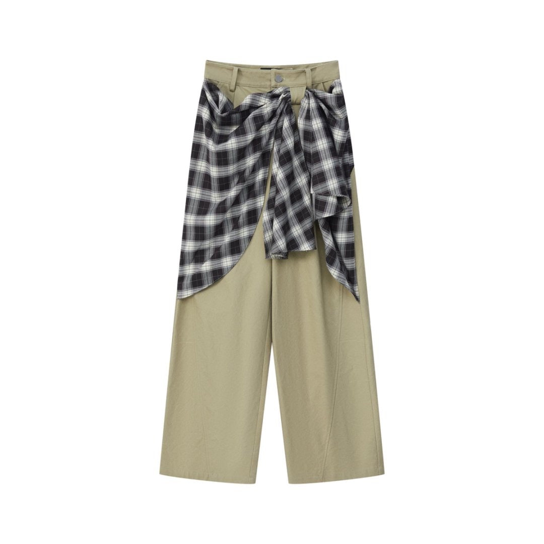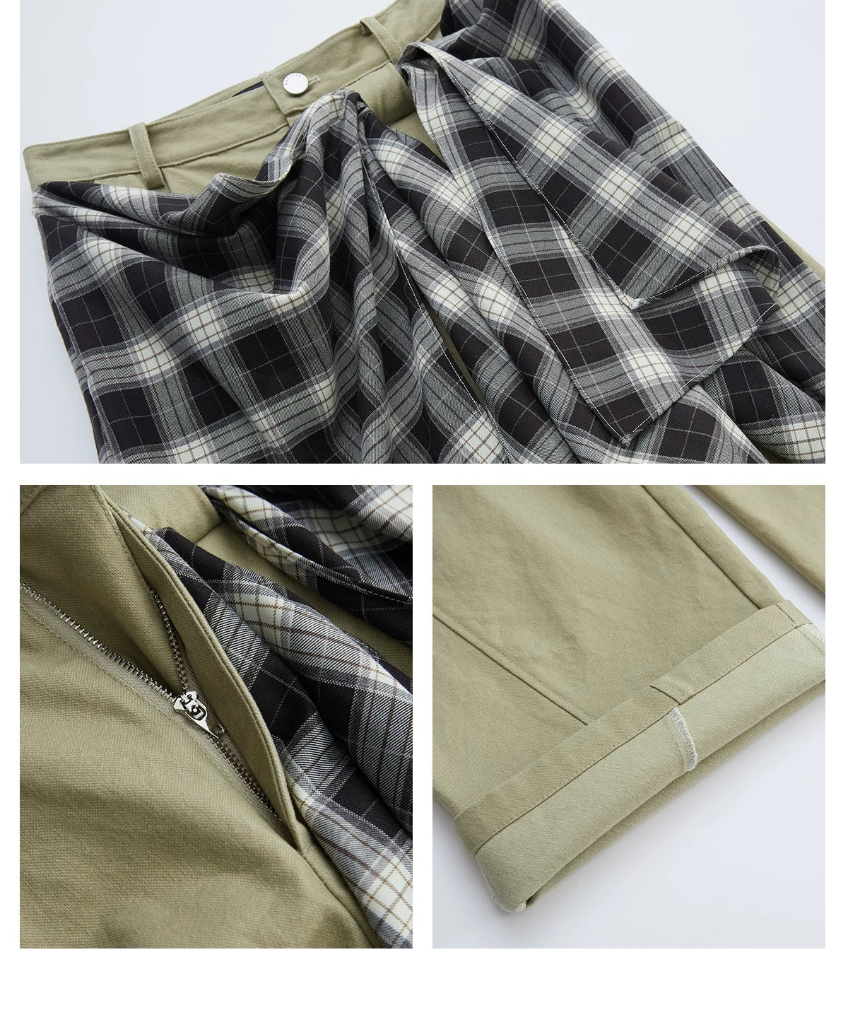 Sofitte Khaki Plaid Strap Patchwork Straight-Leg Trousers