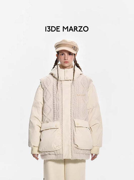 13DE MARZO Bear Weave Knit Patch Down Jacket Cannoli Cream