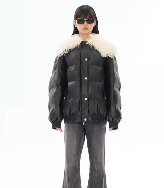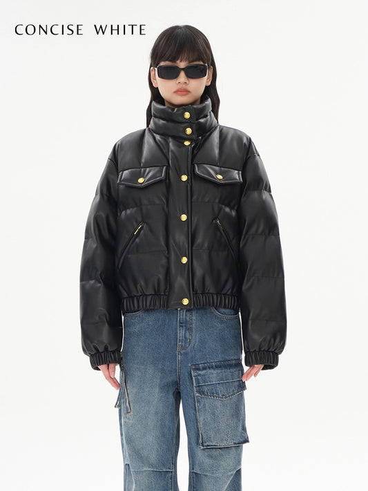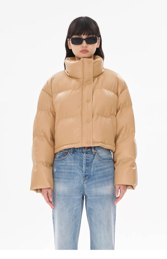 Concise-White PU Puff Cropped Jacket Baby Pink