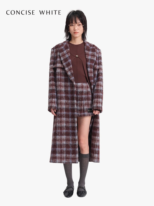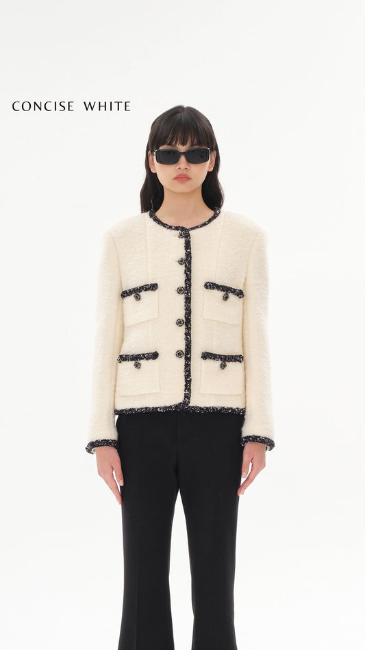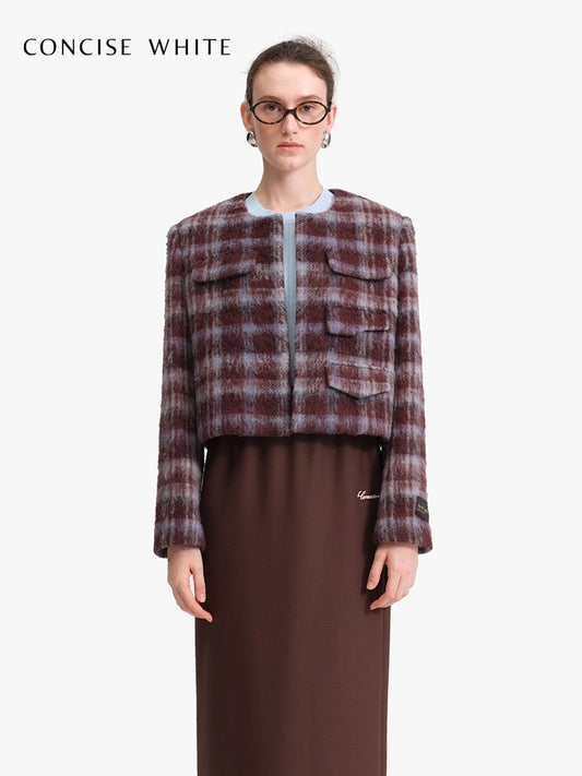 Concise-White Rowling Plaid Pocket Wool Short Coat
