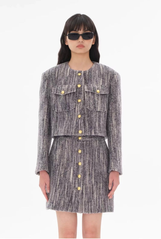 Concise-White Woolen Crew Neck Short Coat and Skirt Set Grey