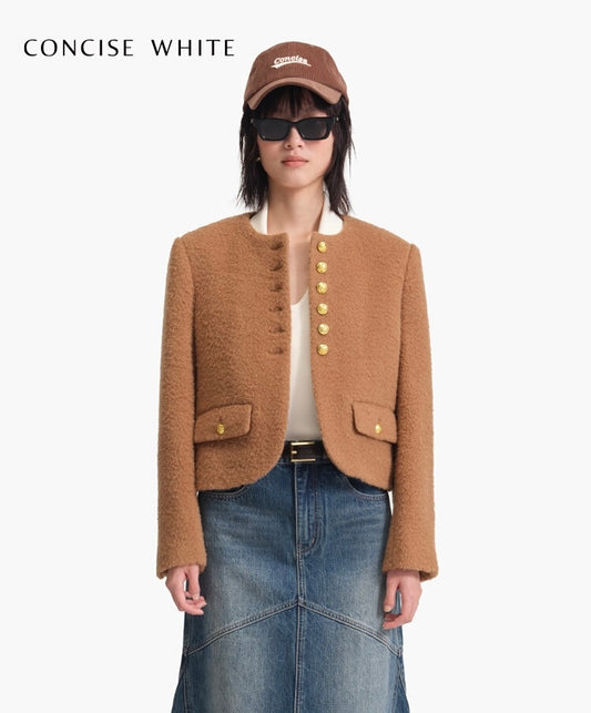 Concise-White Sofia Round Neck Gold Button Short Coat Camel