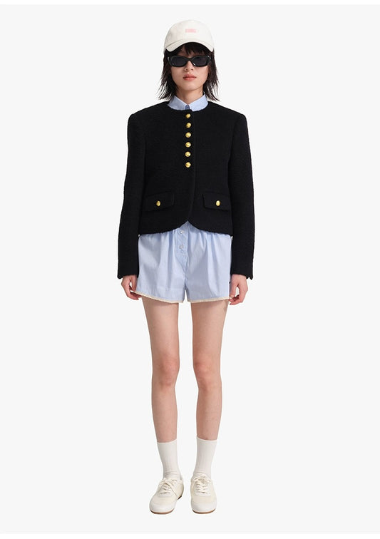 Concise-White Sofia Round Neck Gold Button Short Coat Black