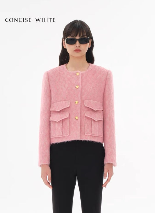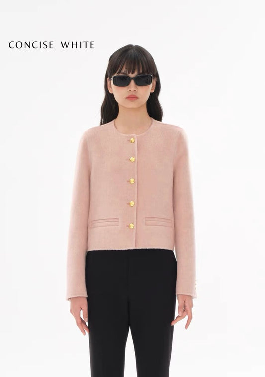 Concise-White Gold Buckle Roundneck Wool Short Coat Pink
