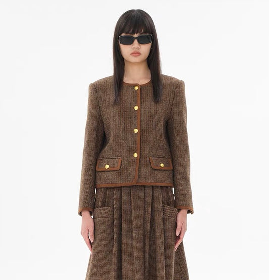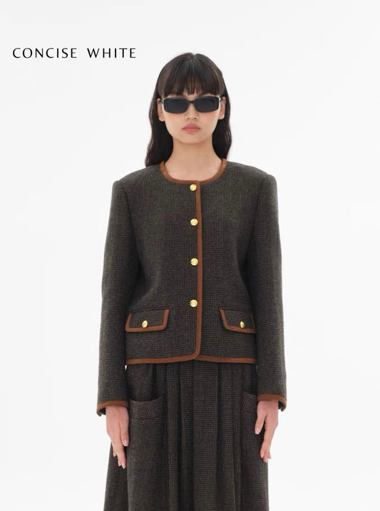 Concise-White Plaid Patchwork Roundneck Wool Suit Coffee