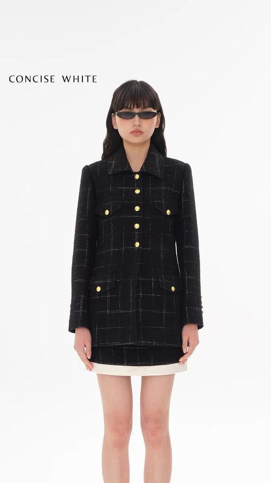 Concise-White Plaid Patchwork Lapel Wool Short Coat and Skirt Set